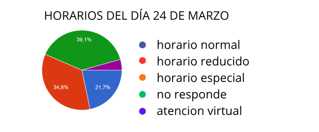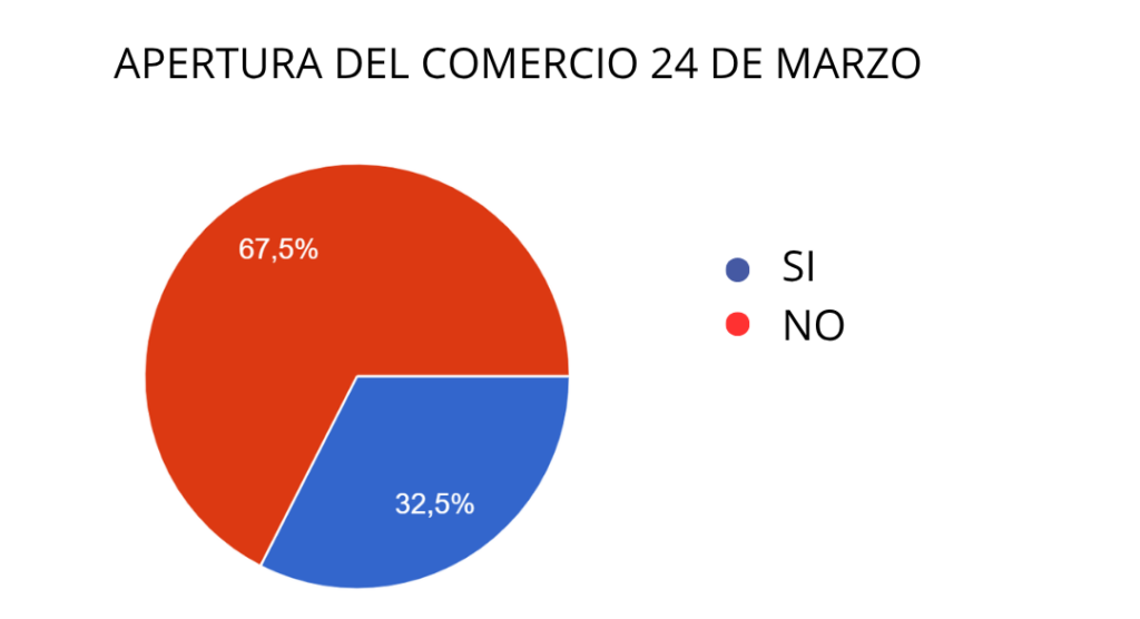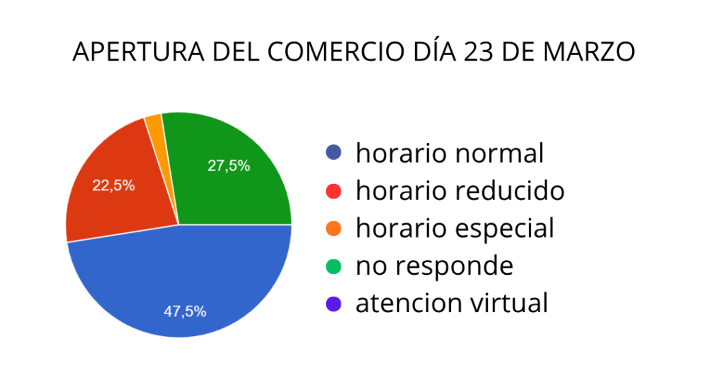 En relación al lunes 23 de marzo, los resultados indican que el 70% de los comercios abrirá sus puertas, mientras que el 30% permanecerá cerrado. En cuanto a la modalidad de trabajo, se observa que una parte importante de los locales funcionará con su plantel habitual, aunque también habrá comercios atendidos por sus dueños o con personal reducido.