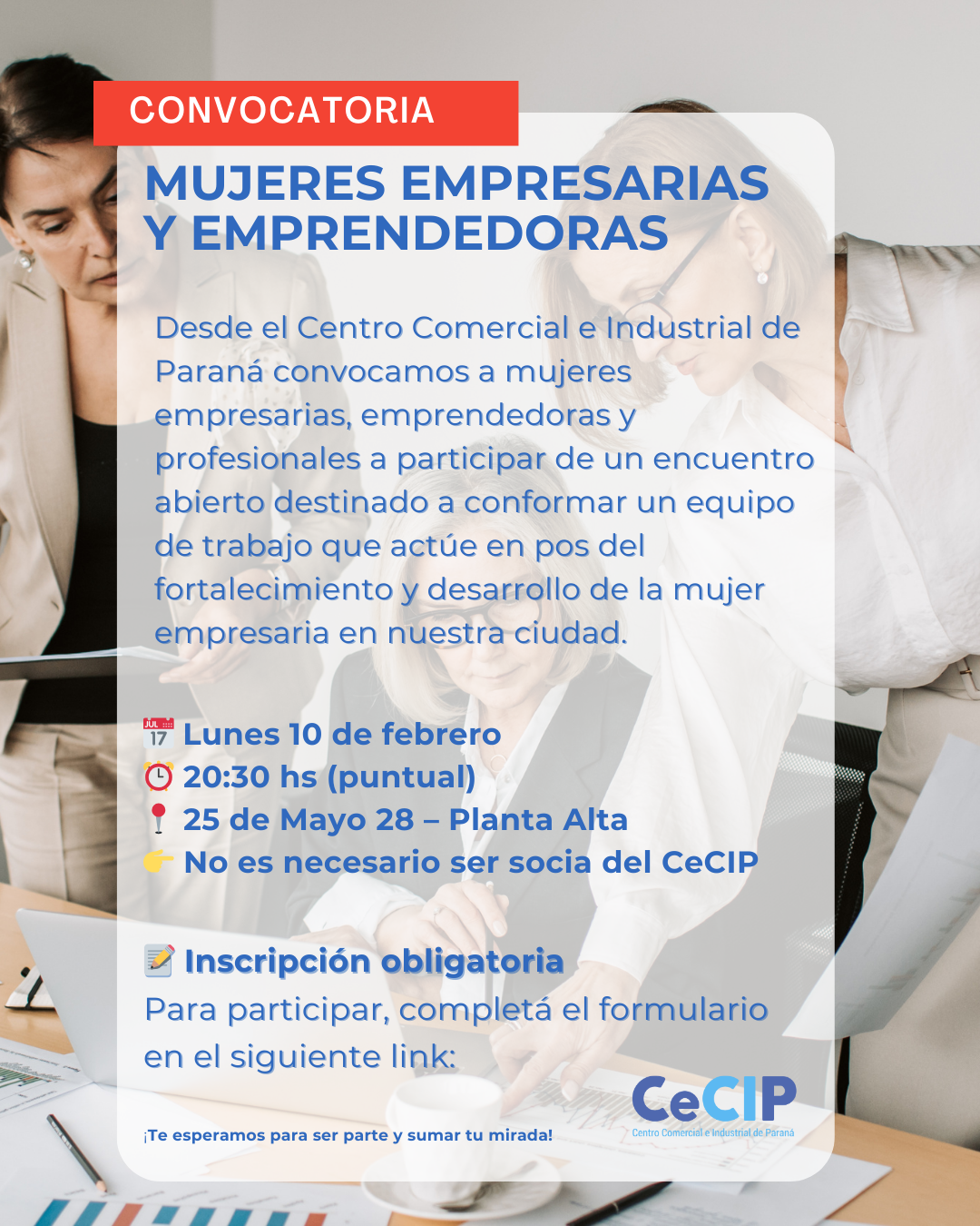Desde el Centro Comercial e Industrial de Paraná convocamos a mujeres empresarias, emprendedoras y profesionales a participar de un encuentro abierto destinado a conformar un equipo de trabajo que actúe en pos del fortalecimiento y desarrollo de la mujer empresaria en nuestra ciudad. 📅 Martes10 de febrero ⏰ 20:30 hs (puntual) 📍 25 de Mayo…