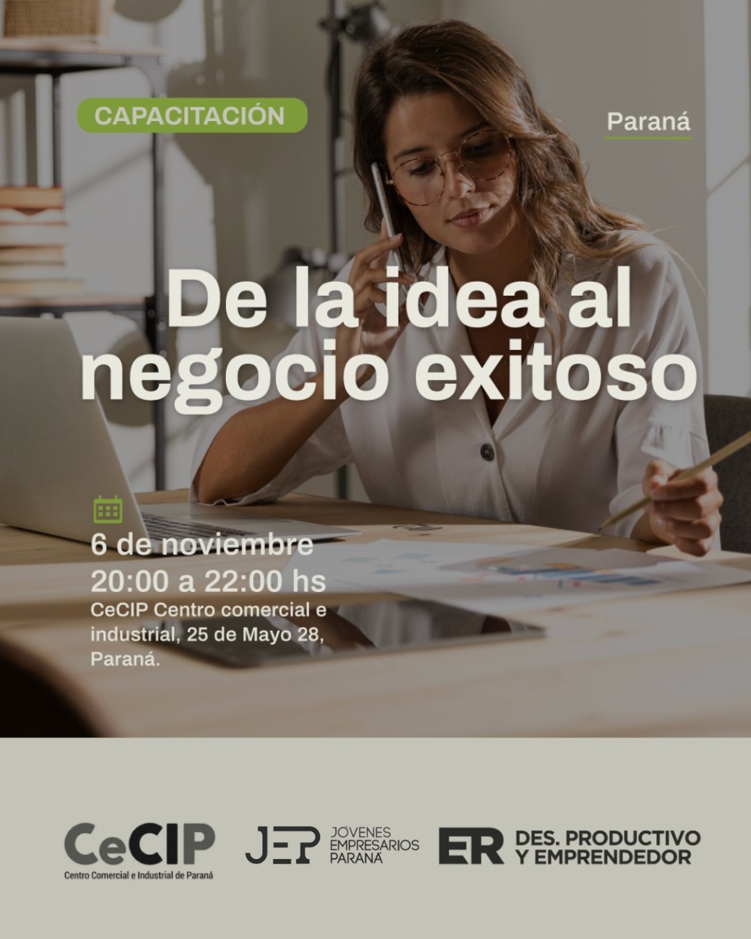 El próximo jueves 6 de noviembre, de 20:00 a 22:00 h, se realizará la capacitación “De la idea al negocio exitoso” en el CeCIP Centro comercial e industrial de Paraná en Paraná